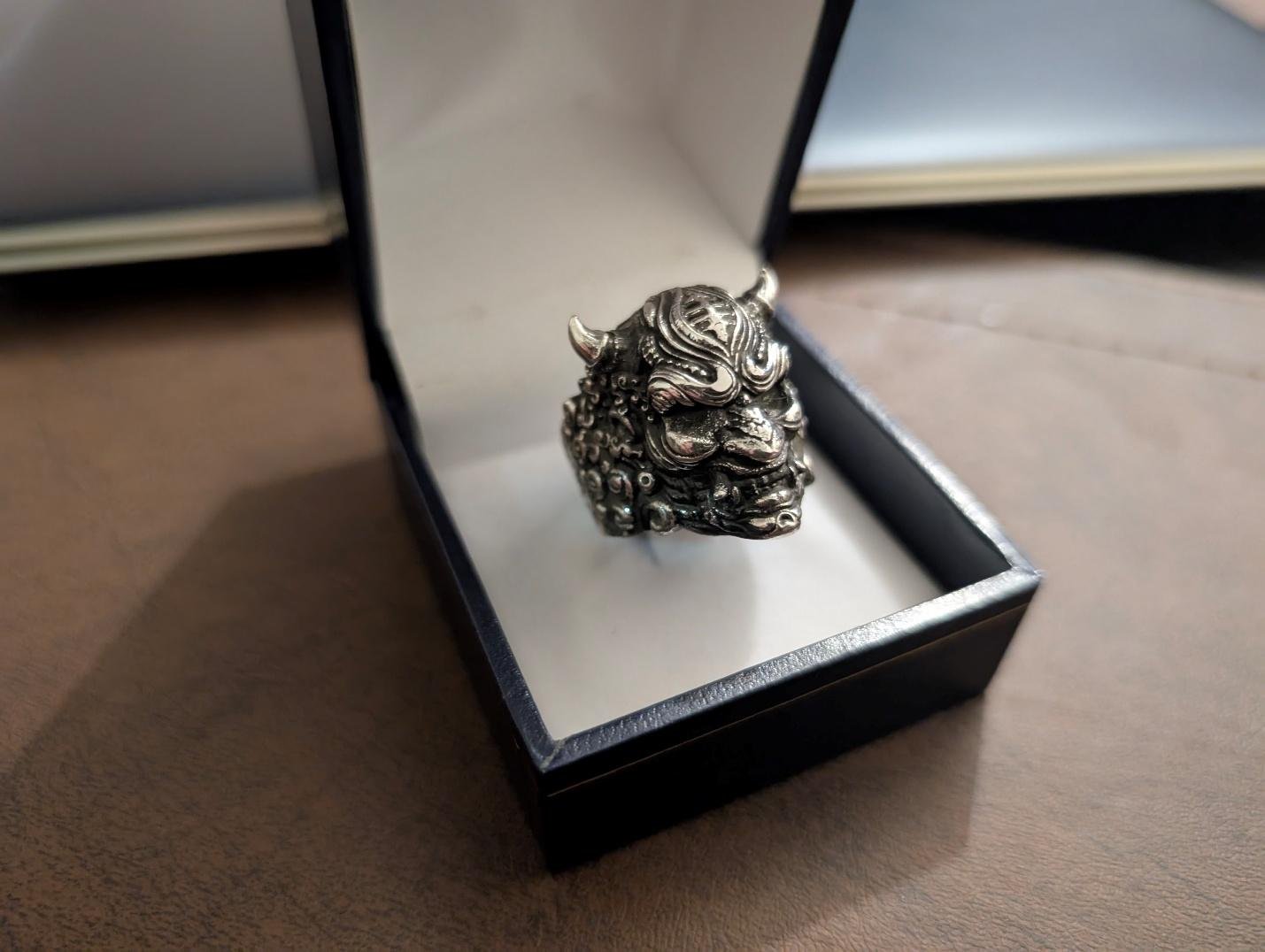 «Forjado” en las profundidades de la noche, donde las estrellas se funden con la luna llena, este anillo macizo de plata 950 evoca la esencia misma del guerrero samurai. La máscara oni, tallada con maestría, captura la furia y la belleza de un otoño embravecido. Sus cuernos, como ramas desnudas azotadas por el viento, se alzan desafiantes contra el cielo crepuscular. Los ojos, profundos y penetrantes como la mirada de un halcón, reflejan la sabiduría ancestral y la ferocidad de un corazón indómito. Cada detalle, desde las arrugas que surcan su rostro hasta las venas que recorren sus cuernos, es un testimonio del poder de la naturaleza y la fuerza del espíritu. Al deslizar este anillo en tu dedo, te conviertes en guardián de un legado ancestral”